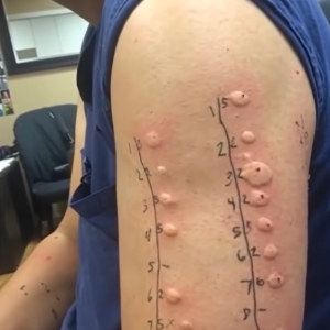 In the image we see a human arm covered with a series of small, reddish bumps, arranged neatly in two vertical rows and marked with handwritten numbers. At first glance the scene might…